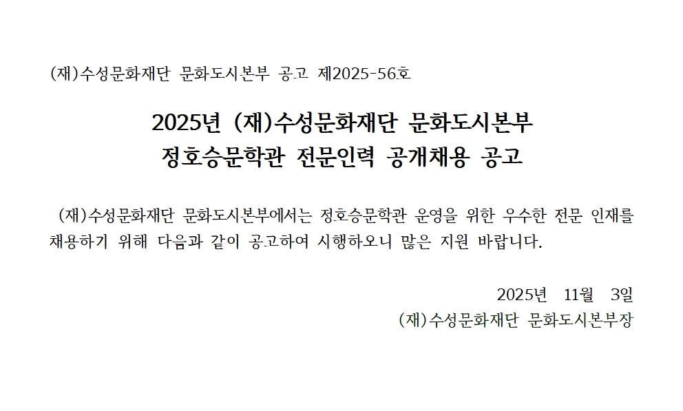 2025-11-03 (재)수성문화재단 문화도시본부 정호승문학관 전문인력 공개채용 공고 작성자 문화도시센터 조회수 1826 채용공고문.hwp(27.00KB) 응시서류.hwp(24.50KB) 채용서류 반환청구서.hwp(13.50KB) 목록