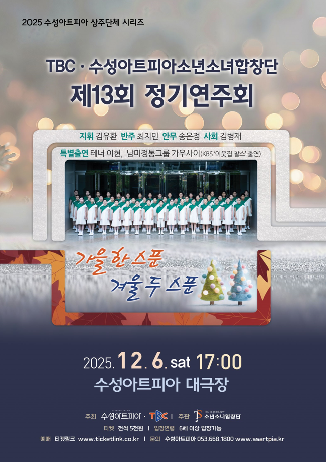 (재)수성문화재단 수성아트피아(이사장 김대권)는 TBC·수성아트피아 소년소녀합창단이 오는 2025년 12월 6일(토) 오후 5시, 수성아트피아 대극장에서 제13회 정기연주회 「가을 한 스푼, 겨울 두 스푼」 을 개최한다고 밝혔다.
