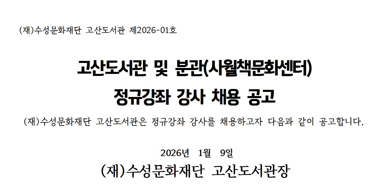 2026-01-09 2026년도 고산도서관 및 분관(사월책문화센터) 정규강좌 강사 채용 공고 작성자 고산도서관 조회수 3514 [공고] 고산도서관 및 분관 정규강좌 강사 공개 채용 공고(제2026-01호).pdf(113.06KB) [붙임] 고산도서관 및 정규강좌 강사 공개 채용 제출 서류.hwp(79.50KB) 목록