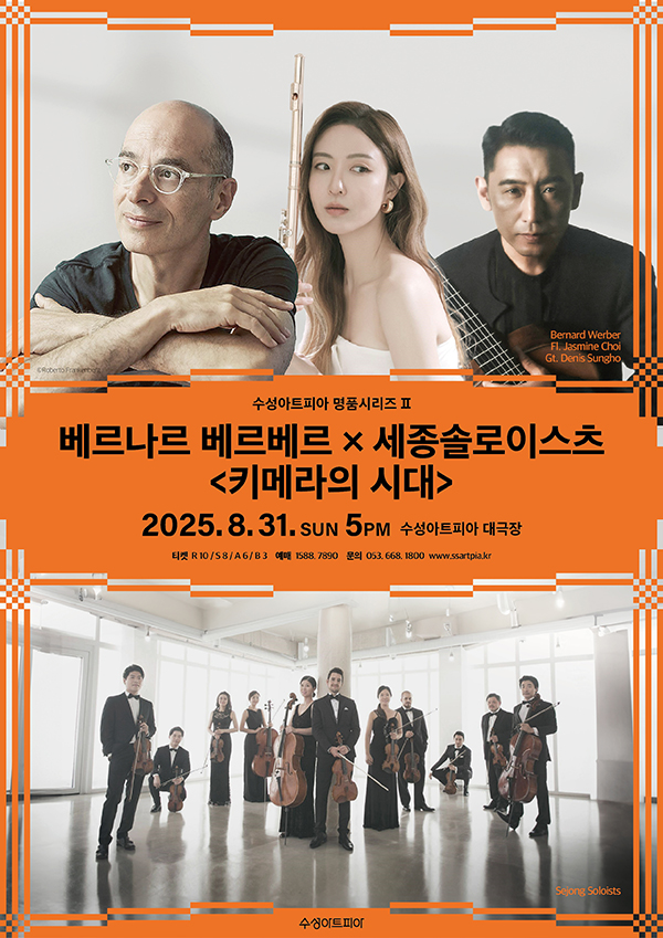 (재)수성문화재단 수성아트피아(이사장 김대권)는 2025년 8월 31일 일요일 오후5시 세계적인 작가 베르나르 베르베르와 대한민국 대표 실내악단 세종솔로이스츠, 그리고 세계적 아티스트 플루티스트 최나경, 기타리스트 드니 성호가 함께하는 융복합 공연 <키메라의 시대>를 선보인다. 이 공연은 2025년 수성아트피아 <명품시리즈>의 하이라이트이자, 문학과 음악의 경계를 허물며 새로운 예술 형식의 가능성을 제시하는 특별한 기획이다.