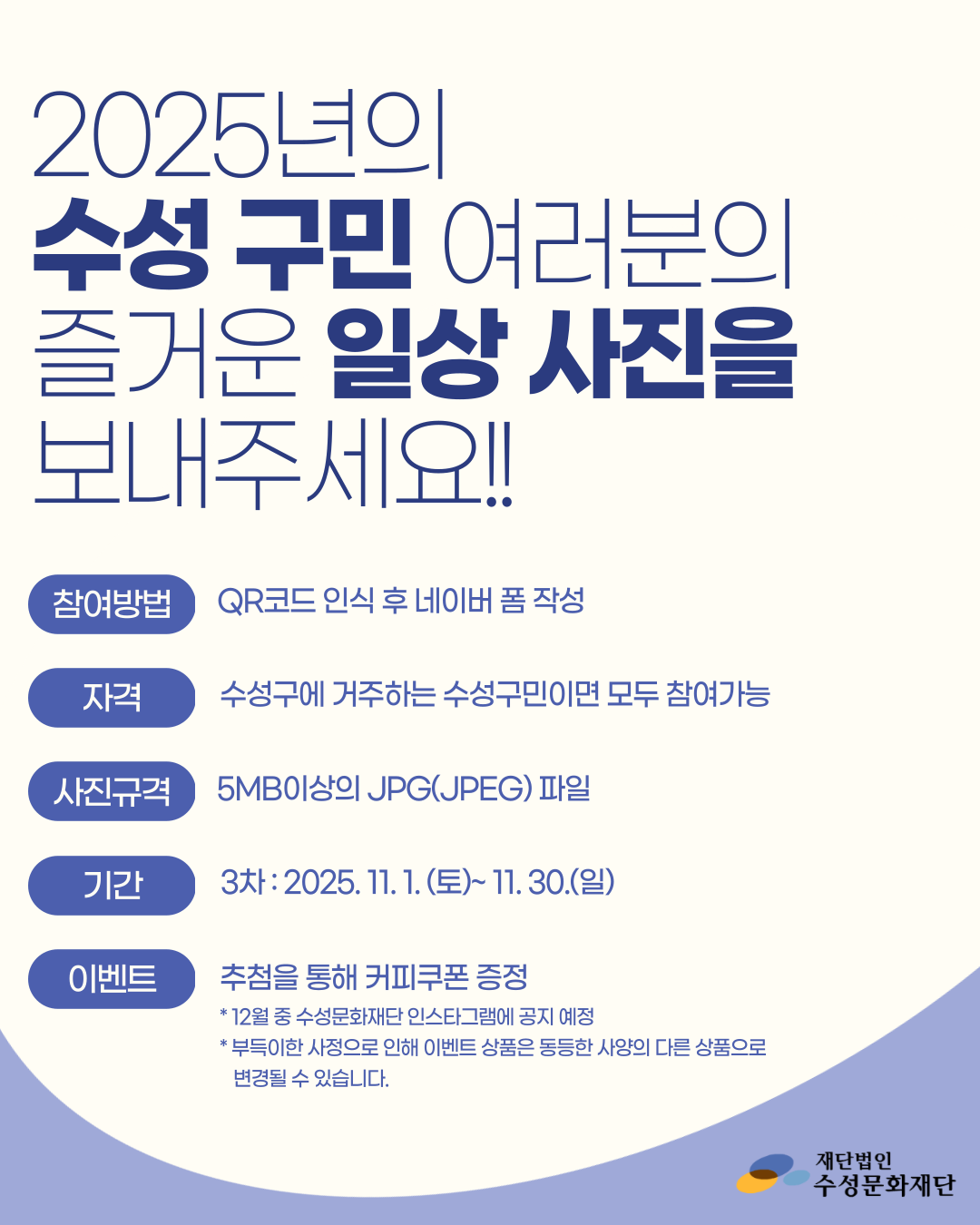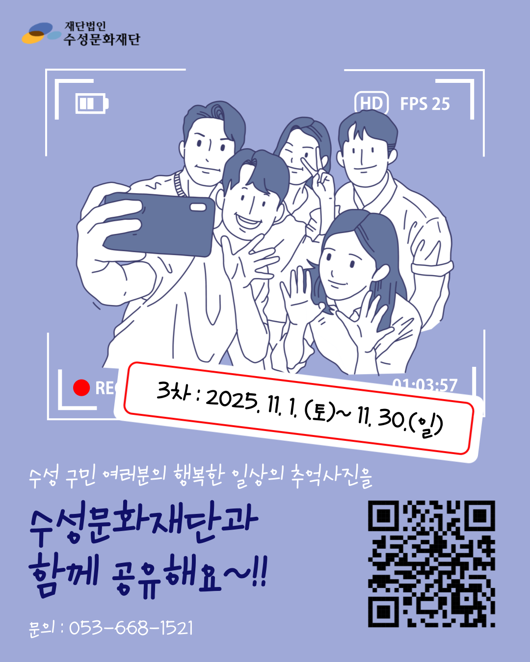 2025-11-04 2025 수성구 생활상 미디어아카이브 수성구민 사진모집(3차) 작성자 문화정책팀 조회수 10978 첨부파일없음 3차 : https://naver.me/FAPQPvy6 목록