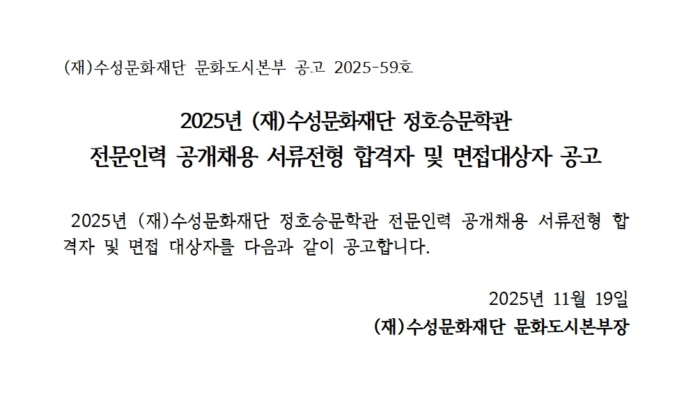 2025-11-19 2025년 (재)수성문화재단 정호승문학관 전문인력 공개채용 서류전형 합격자 및 면접대상자 공고 작성자 도시재생지원센터 조회수 1653 서류전형 합격자 및 면접대상자 공고 1부.pdf(45.28KB) 목록