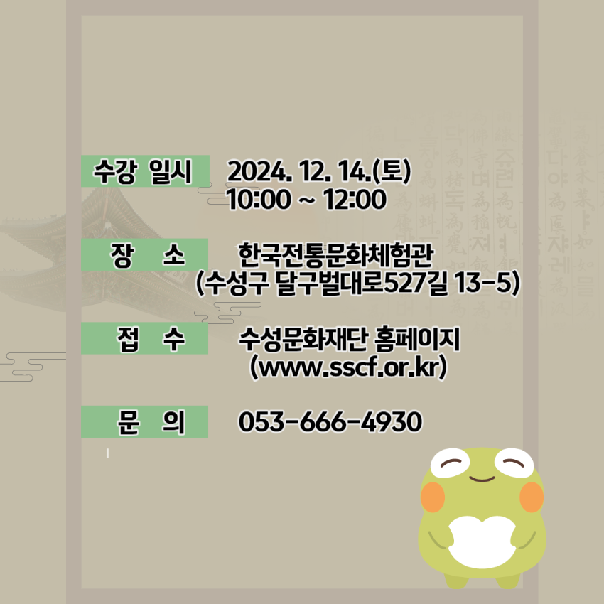 ● 문 의 : 053-666-4930, 053-668-4013 / 카카오톡플러스친구 : 모명재한국전통문화체험관